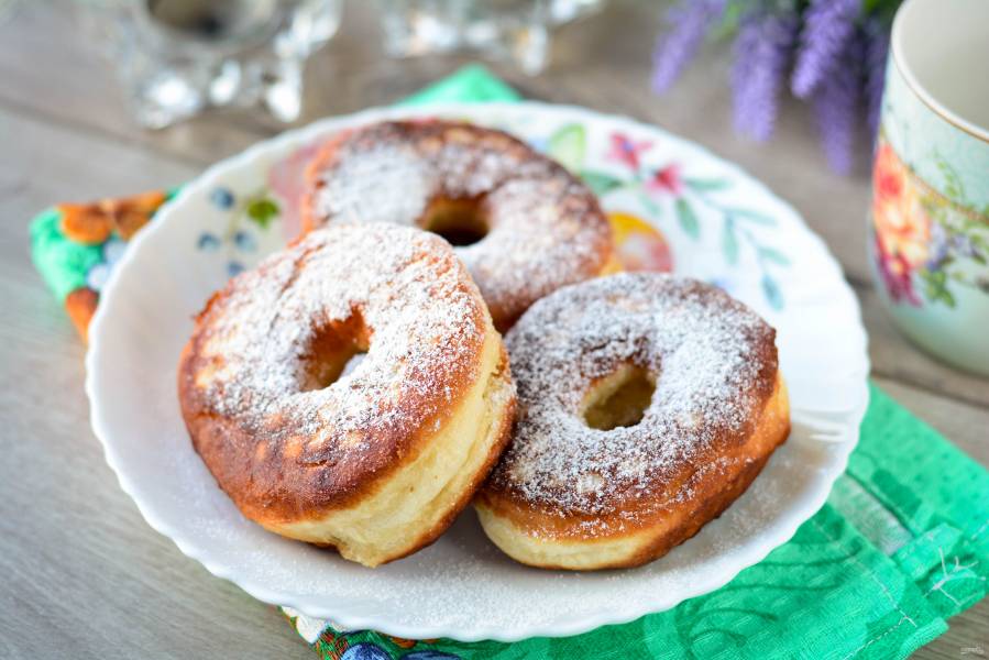 Пончики готовы, когда тесто медленно пружинит после прикосновения к нему кончиком пальца (если оно сразу пружинит, значит, ему нужно больше времени; если оно слипается, значит, оно передержалось, и вы можете снова раскатать тесто и разрезать его один раз).