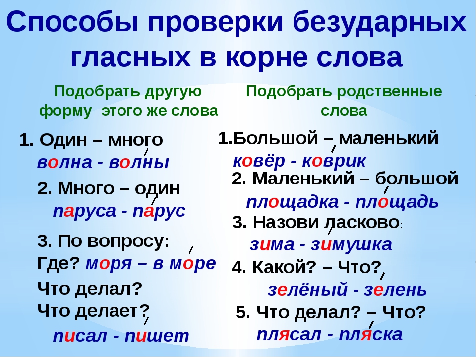 Чтобы проверить безударную гласную в корне слова, необходимо подобрать такое однокоренное слово, чтобы ударение в нем падало на проверяемую гласную.