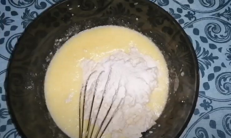 - Яйцо взбить с сахаром, смешать с манкой, добавить растопленное, но не горячее масло, просеять муку и замесить тесто.