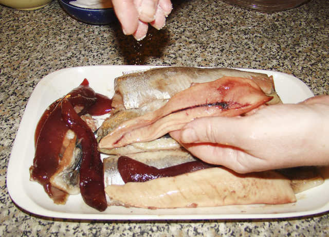 Слегка посыпать сельдь мукой и приправить с обеих сторон.